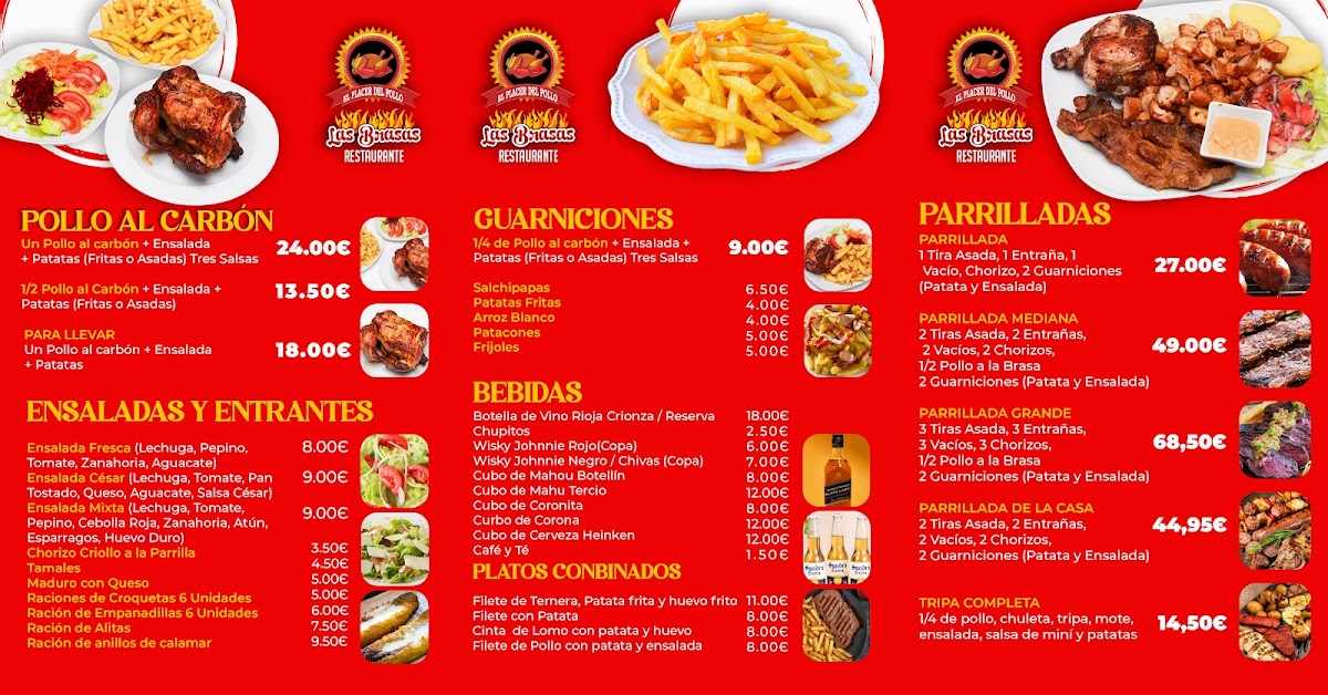 **About Las Brasas Pollos al Carbon**Nestled in Puente de Vallecas, Madrid, Las Brasas Pollos al Carbon specializes in mouthwatering grilled chicken, expertly seasoned to perfection. Patrons rave about the crispy fried potatoes and flavorful chicken, which evokes a sense of home and comfort. The charming atmosphere is complemented by signature sauces and dishes, like the popular "tripa mishqui," ensuring something for everyone. While service may be average, the incredible flavors and enticing aromas make Las Brasas a must-visit. Whether dining in or taking food to go, this establishment promises a delicious culinary experience that keeps customers coming back for more.